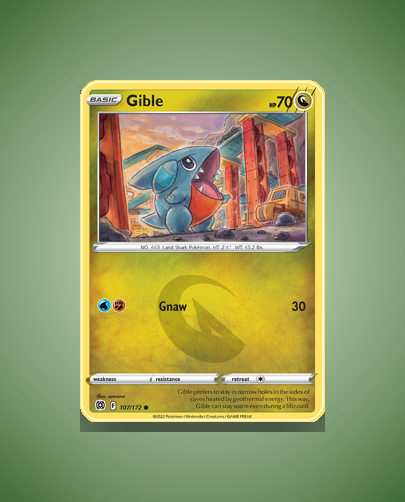 Gible from the Brilliant Stars set is a common card numbered 107 with 70 HP. This spirited Pokémon features the straightforward attack Gnaw. Its simple design makes it a notable addition for collectors seeking versatile cards.