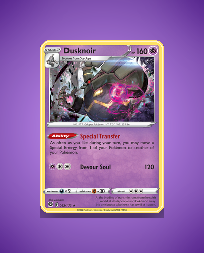 - Brilliant Stars (swsh9): Introduced Dusknoir with its Special Transfer ability and Devour Soul attack, emphasizing energy manipulation and strong offensive potential in a Psychic-type Stage 2 Pokémon.