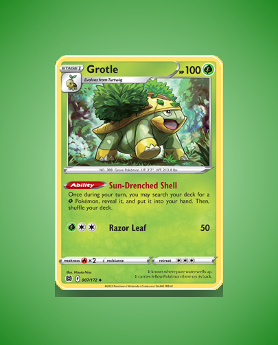 - Brilliant Stars: This set features Grotle as a Stage 1 Grass-type with a useful ability for deck consistency and a solid attack. It fits well into Grass-themed decks but is not currently tournament-legal.