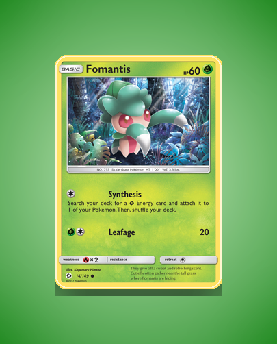 This guide focuses on the exact printing of Fomantis from the Sun Moon set, card number 14. It is a common rarity card with no known alternate printings or special editions. The card’s artwork by Kagemaru Himeno is a notable feature for collectors who appreciate classic Pokémon TCG art styles.