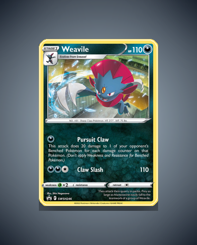 - SWSH Black Star Promos: Promotional cards like this Weavile often feature unique artwork and attacks not found in main expansion sets. This card stands out for its tactical “Pursuit Claw” and dependable damage from “Claw Slash.”