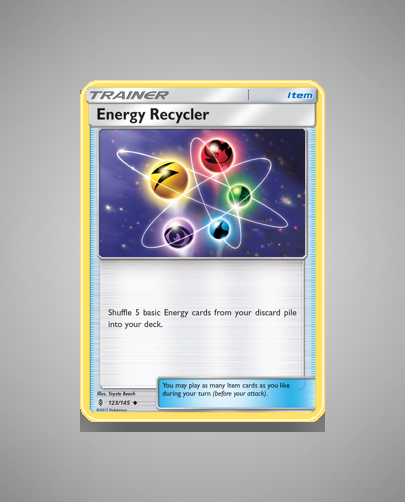 - Rules Text: Shuffle 5 basic Energy cards from your discard pile into your deck. You may play as many Item cards as you like during your turn (before your attack).