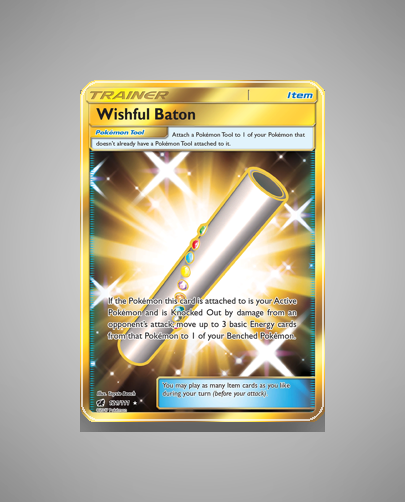Wishful Baton is a Rare Secret card from the Crimson Invasion set. As card number 121, it stands out with its unique design and rarity. This collectible piece adds a distinctive touch to any Pokémon TCG collection.