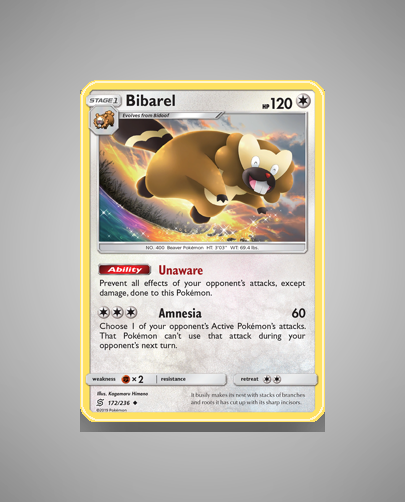 Bibarel from the Unified Minds set is an Uncommon Pokémon card with 120 HP. It features the Ability Unaware and the attack Amnesia. This card is numbered 172 in the set.
