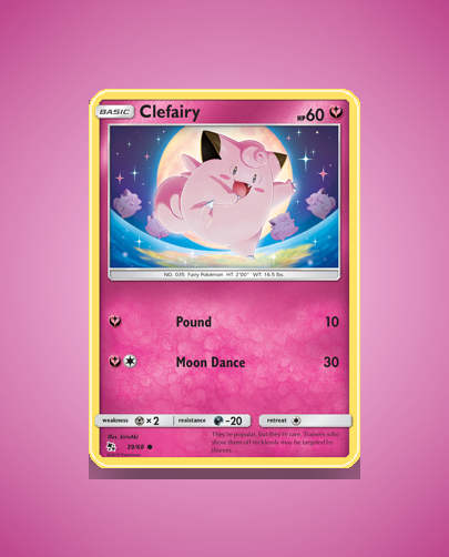 Clefairy is a Common card from the Hidden Fates set, numbered 39. This charming Pokémon has 60 HP and features the attacks Pound and Moon Dance. Its simple design makes it a delightful addition to any collection.