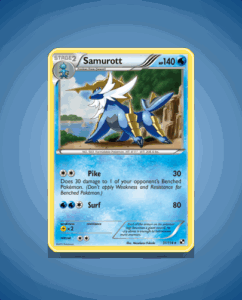 Samurott from the Black White set is a Rare Holo card numbered 31. It boasts a solid 140 HP, making it a sturdy addition to any deck. Its notable attack, Surf, offers a dynamic option for gameplay.