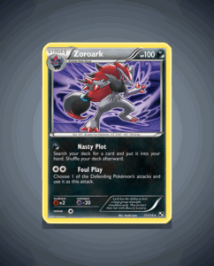 Zoroark from the Black White set is a Rare Holo card featuring 100 HP. This sleek Pokémon is known for its strategic attack, Nasty Plot. Its card number is 71, making it a distinctive addition to any collection.