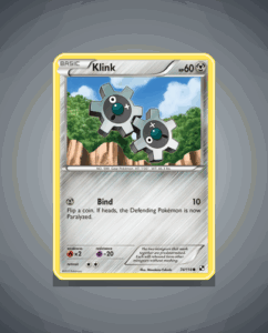 Klink from the Black White set is a common Pokémon card numbered 74. It has 60 HP and features the attack Bind. This straightforward card offers a solid addition to any collection.