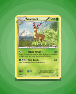 Sawsbuck is a Rare Pokémon card from the Black White set, numbered 14. It features 90 HP and a single attack called Horn Leech. This card offers a straightforward yet engaging addition to any collection.