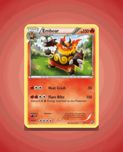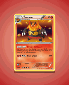 Emboar from the Black White set is a Rare Holo card numbered 20 with a sturdy 150 HP. It features the dynamic ability Inferno Fandango and the powerful attack Heat Crash. This card offers a vibrant addition to any collection with its fiery presence.