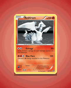Reshiram from the Black White set is a Rare Ultra card featuring 130 HP. This striking Pokémon wields the powerful attack Blue Flare. It holds card number 113 in the set.