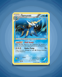 Samurott from the Black White set is a Rare Holo card numbered 32, boasting a sturdy 140 HP. It features the defensive ability Shell Armor and the powerful attack Hydro Pump, making it a notable addition to any collection.