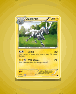 Zebstrika is an uncommon Pokémon from the Black White set, numbered 42. It has a vibrant 90 HP and features the dynamic attack Wild Charge. This energetic card adds a lively spark to any collection.