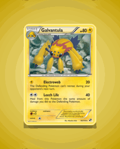 Galvantula is a Rare Pokémon card from the Black White set, numbered 46. This energetic card boasts 80 HP and features the attack Leech Life. Its design captures the dynamic essence of the character.