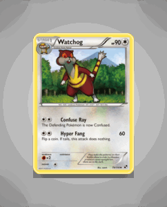Watchog from the Black White set is an uncommon card with 90 HP. It features the attack Hyper Fang, showcasing its sharp biting power. This card is numbered 79 in the set.