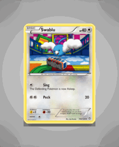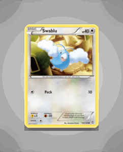 Swablu is a Common Pokémon card from the Dragons Exalted set, numbered 105. This card features 40 HP and a straightforward attack called Peck. Its simple design makes it a charming addition for collectors seeking basic yet appealing cards.