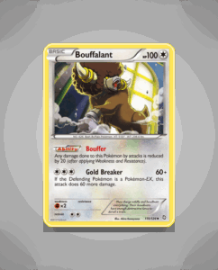 Bouffalant from the Dragons Exalted set is an uncommon card with 100 HP. It features the ability Bouffer and the attack Gold Breaker. This vibrant card is numbered 110 in the set.