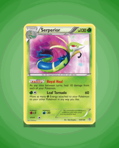 Serperior from the Dragons Exalted set is a Rare Secret card numbered 125. It boasts a sleek 130 HP and features the ability Royal Heal, enhancing its strategic value. Its attack, Leaf Tornado, adds a dynamic edge to gameplay.