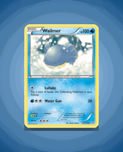 Wailmer from the Dragons Exalted set is an uncommon Pokémon card numbered 25. It boasts a robust 100 HP, making it a sturdy addition to any deck. Its sole attack, Water Gun, offers straightforward aquatic offense. This card captures Wailmer’s playful spirit with simple yet…