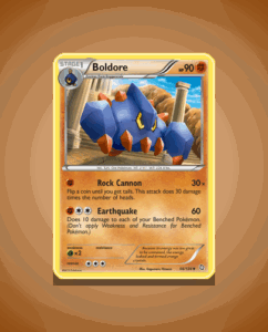 Boldore is an uncommon Pokémon from the Dragons Exalted set, numbered 66. It has a sturdy 90 HP and features the powerful Earthquake attack. This card offers solid gameplay potential with its straightforward design.