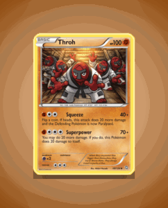 Throh from the Dragons Exalted set is an Uncommon Pokémon card numbered 68. It boasts a sturdy 100 HP and features the powerful attack Superpower. This card offers a solid addition to any collection seeking balanced strength.