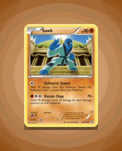 Sawk from the Dragons Exalted set is an Uncommon card numbered 69 with 90 HP. This sturdy fighter features the attack Karate Chop, showcasing its straightforward combat style. Its design captures the essence of a disciplined martial artist in the Pokémon TCG.