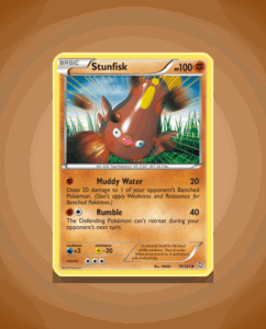 Stunfisk from the Dragons Exalted set is an uncommon card numbered 70. It boasts a solid 100 HP and features the attack Rumble. This sturdy Pokémon offers a reliable presence in any deck.