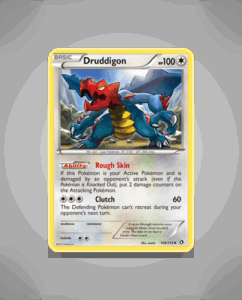 Druddigon from the Legendary Treasures set is an uncommon card boasting 100 HP. It features the Rough Skin ability and a single attack called Clutch. This card is numbered 106 in the set.