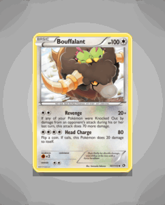 Bouffalant from the Legendary Treasures set is an Uncommon card numbered 107. It has a sturdy 100 HP and features the attack Head Charge. This card offers a solid presence for collectors seeking balanced Pokémon.
