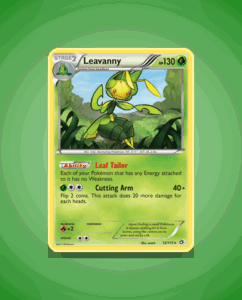 Leavanny from the Legendary Treasures set is a Rare Holo card with 130 HP. It features the ability Leaf Tailor and the attack Cutting Arm. This card is numbered 12 in the set.