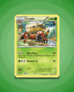 Crustle from the Legendary Treasures set is an uncommon card numbered 14 with 100 HP. This sturdy Pokémon features the attack Hammer In, showcasing its solid offensive capability. Its design captures the rugged essence of Crustle, making it a notable addition for collectors.