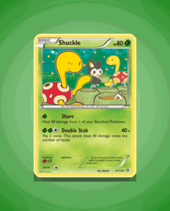 Shuckle from the Legendary Treasures set is an uncommon card numbered 3. It features a sturdy 80 HP and a single attack called Double Stab. This card offers a straightforward yet engaging addition to any collection.