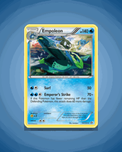 Empoleon from the Legendary Treasures set is a Rare card numbered 35. This striking Pokémon boasts 140 HP and features the powerful attack Emperor’s Strike. Its design captures a commanding presence suited to its name.