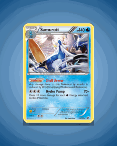 Samurott from the Legendary Treasures set is a Rare Holo card numbered 39. It boasts a solid 140 HP and features the Shell Armor ability. Its attack, Hydro Pump, delivers a powerful water-based strike. This card combines durability with a striking aquatic offense.