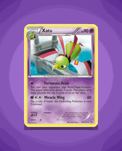 Xatu from the Legendary Treasures set is a rare card numbered 56 with 90 HP. It features the attack Miracle Wing, adding a distinctive touch to its battle capabilities. This card’s design captures Xatu’s mystic essence in a striking way.