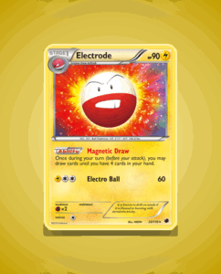 Electrode from the Plasma Freeze set is a Rare Holo card numbered 33 with 90 HP. It features the ability Magnetic Draw and the attack Electro Ball. This card offers a dynamic addition to any collection with its vibrant design and strategic potential.