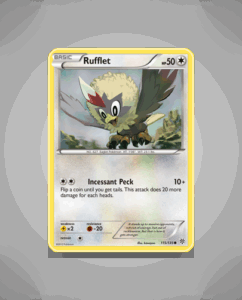 Rufflet is a common Pokémon card from the Plasma Storm set, numbered 115. It features a modest 50 HP and a single attack called Incessant Peck. This straightforward card offers a clear and simple addition to any collection.
