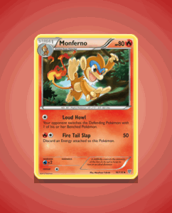 Monferno from the Plasma Storm set is an uncommon card numbered 16. This lively Pokémon boasts 80 HP and features the attack Fire Tail Slap. Its vibrant design captures the energetic spirit of Monferno in battle.