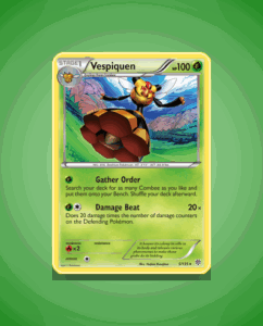 Vespiquen from the Plasma Storm set is a rare card with 100 HP. It features the attack Damage Beat, offering a straightforward offensive option. This card holds a solid place in the set’s lineup.