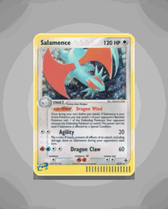 Salamence from the Dragon set is a Rare Holo card featuring 120 HP. This striking Pokémon boasts the ability Dragon Wind and the powerful attack Dragon Claw. It stands out as a vivid example of the set’s dragon-themed lineup.