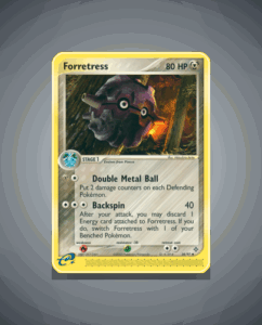 Forretress is an uncommon card from the Dragon set, numbered 28. It features a sturdy 80 HP and a single attack called Backspin. This compact card offers a straightforward addition to any collection.
