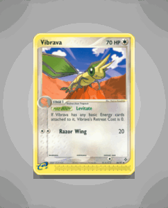 Vibrava is an Uncommon card from the Dragon set, featuring 70 HP. This agile Pokémon has the Levitate ability, enhancing its evasive qualities. Its attack, Razor Wing, reflects its swift and sharp nature in battle.