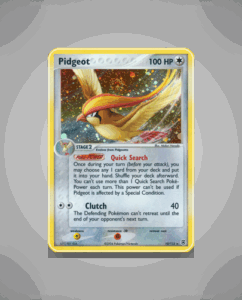 Pidgeot from the FireRed LeafGreen set is a Rare Holo card featuring 100 HP. This agile Pokémon boasts the Quick Search ability and the Clutch attack. It is card number 10 in the set, making it a notable addition for collectors.