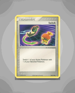 Switch is a Common Trainer card from the FireRed LeafGreen set. Numbered 102, this card plays a vital role in strategic gameplay by allowing players to swap their Active Pokémon with one on the Bench. Its straightforward design makes it a staple in many decks.