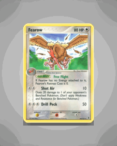 Fearow is a rare card from the FireRed LeafGreen set, numbered 24. It boasts 80 HP and features the ability Free Flight. Its notable attack is Drill Peck, making it a distinctive addition to any collection.