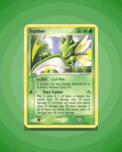 Scyther from the FireRed LeafGreen set is a rare card with 60 HP. It features the ability Leaf Ride and the attack Fury Cutter. This agile Pokémon is number 29 in the collection.