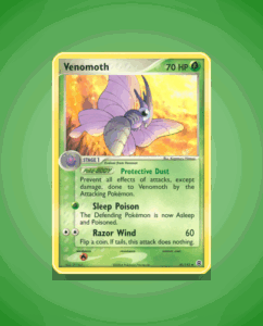 Venomoth from the FireRed LeafGreen set is an uncommon card with 70 HP. It features the ability Protective Dust and a sharp attack called Razor Wind. This card is numbered 49 in the set.