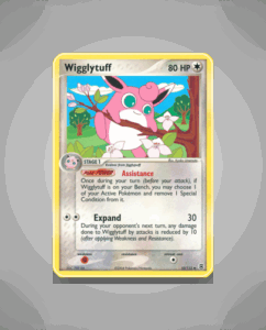 Wigglytuff from the FireRed LeafGreen set is an uncommon card numbered 52 with 80 HP. It features the ability Assistance and the attack Expand, offering strategic options during play. This card’s design reflects the classic style of the set.