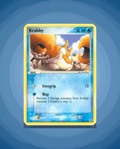 Krabby from the FireRed LeafGreen set is a common card numbered 66 with 50 HP. Its attack, Irongrip, reflects the Pokémon’s sturdy claws. This straightforward card offers a solid addition for collectors focusing on early-generation sets.