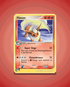 Flareon from the Sandstorm set is a Rare Holo card numbered 5. It boasts 80 HP and features the dynamic Flamethrower attack. This vibrant card captures Flareon’s fiery essence with striking artwork.